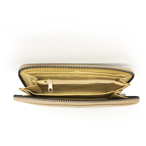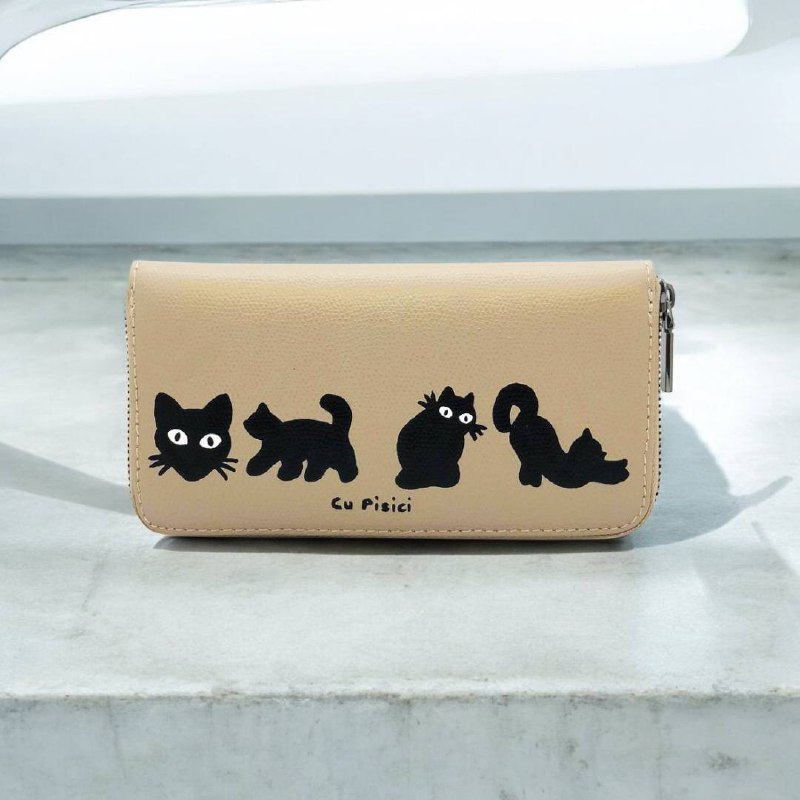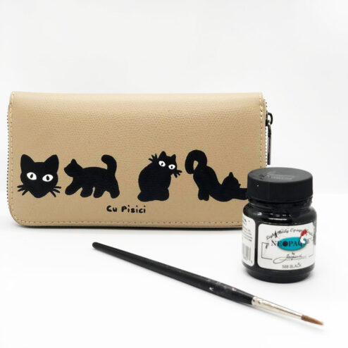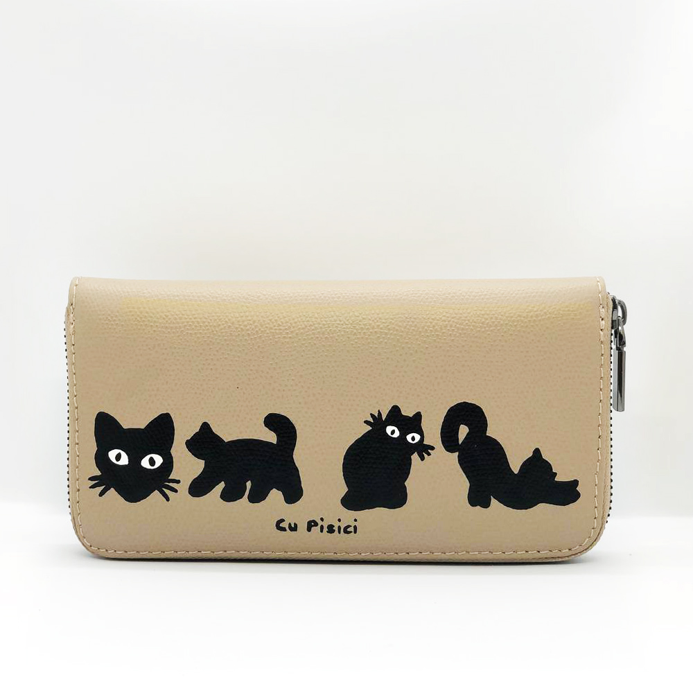 Portofel din piele naturala-Cats in Black, pictat manual, Bej