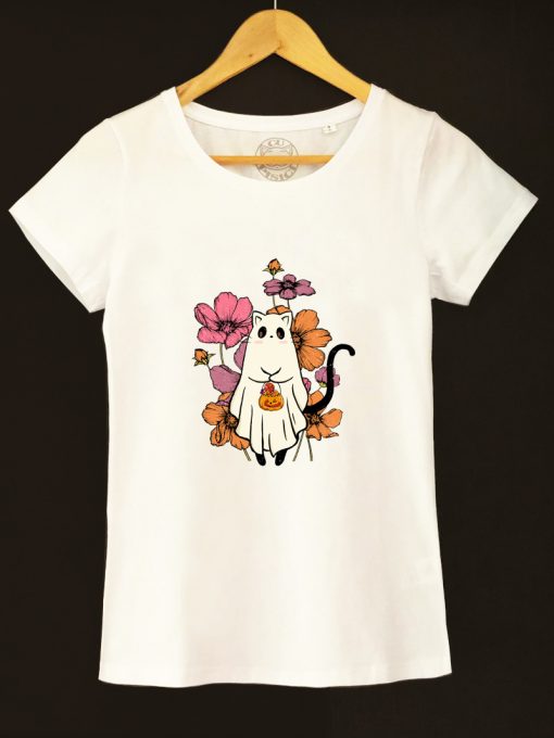Si tie iti place Halloweenul? Daca da, intra in atmosfera sarbatoarei purtand acest Tricou bumbac organic-Cute Halloween Cat, Femei, si ingrozeste-i pe toti din jurul tau! Miau!